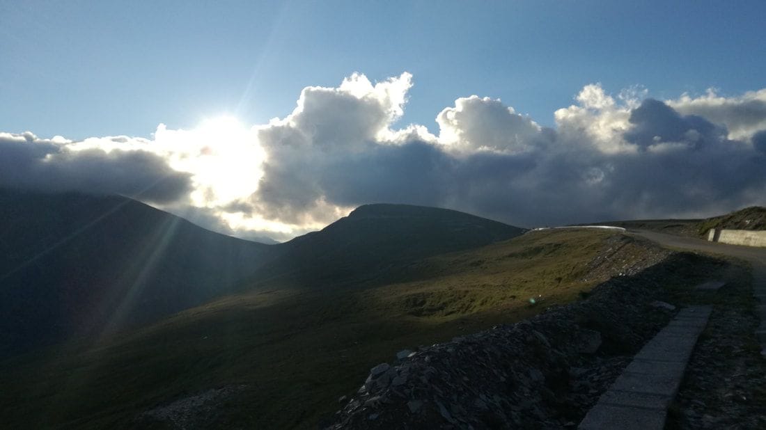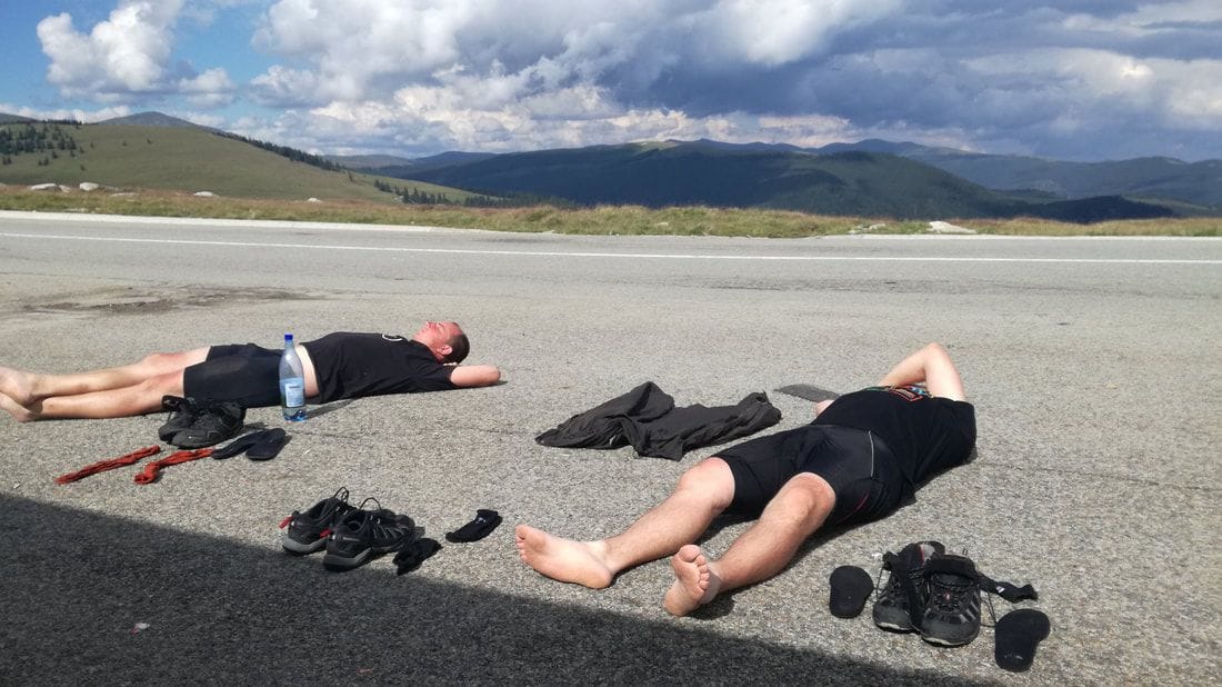 Rankiem pogoda się zmienia. Zaczyna kropić. Szybkie ognisko, które rozpalam jeszcze z żaru z dnia poprzedniego. Jemy śniadanie i w końcu ruszamy w dalszą trasę. Dziś w planach mamy zrobienie całej Transalpiny. Kiedy do niej docieramy, okazuje się dużo mniej ruchliwsza niż Trasa Transfogarska. Nie ma tu właściwie ruchu. Pogoda się łamie. Nie jest źle, jest ciepło, jadę bez koszulki, ale pada mocno. Pedałujemy pod górę, ale Luk zostaje trochę w tyle. W końcu zaczyna sypać grad. Zaczynam napierać mocniej na pedały, szukając czegokolwiek, aby się schronić. Jadę, a grad odbija się od mojego ciała, pozostawiając czerwone kropki 🙂 Ludzie jadący od czasu do czasu autem biją nam brawo. Myślą sobie pewnie wtedy o nas, co za idioci…