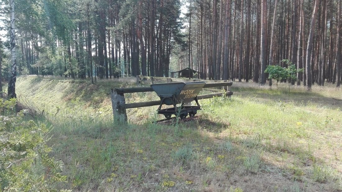 Pogoda dopisuje, jest piękna słoneczna pogoda. Jedziemy przez urokliwy las i dojeżdżamy do wsi Mężyk, w której znajduje się rów ziemny, przy którym stoi kopalniany wagonik z napisem „Wózek Syzyfa”. Przypominamy sobie, że wspominał nam o tym nasz znajomy leśniczy. Rów ma 170 metrów długości, 10 metrów szerokości i 5 metrów głębokości. Został wykopany ręcznie przez Pawła Jechalika zwanego Syzyfem Puszczy Noteckiej. Pan Paweł był właścicielem okolicznych łąk, które notorycznie były zalewane. Chcąc je uratować rozpoczął swoją budowę. Miał wtedy 72 lata i kontynuował pracę przez następnych 11 lat. Jego syn upamiętnił zmarłego ojca i jego trud stawiając tu pamiątkowy głaz i wagonik, którym ojciec wywoził swój urobek.