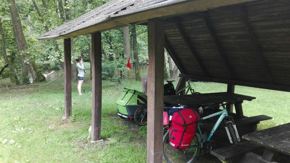 W końcu zaczyna padać i robi się naprawdę chłodno. Jedziemy drogą asfaltową prowadzącą przez las. Szukamy schronienia, nawet zwykłej wiaty. Po około godzinnej jazdy dojeżdżamy do pierwszych zabudowań. Znajdują się tu dwa domy i nic poza tym. Zajeżdżamy do nich, ale nie ma tu nic, pod czym moglibyśmy się schować i zrobić rozgrzewającą herbatę. Lenka na szczęście smacznie śpi. Przyczepka przemokła od spodu. Na szczęście od góry jest wodoodporna, a Lenka w hamaku zawieszona jest jakby w powietrzu. Nie ma więc kontaktu z wilgotną podłogą.