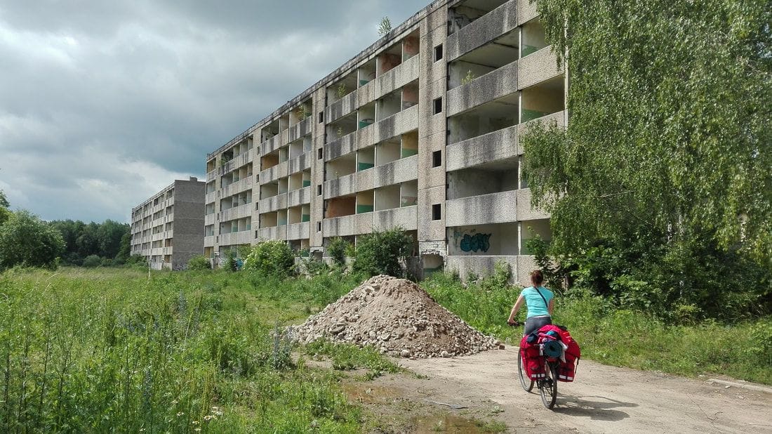 Leje deszcz. Naszym dzisiejszym celem jest Kłomino – miasto widmo. Aby skrócić drogę, jedziemy przez dziki las. Pięknie tu, małe urokliwe jeziorka, piękne polanki, ale ciągle leje zimny deszcz. Jesteśmy przemoczeni. Niestety nasz skrót wiedzie nas w ślepe zagajniki, więc decydujemy się wrócić na szosę. Jedziemy dalej. Lenka dalej śpi. Miała tylko chwilę przerwy od spania na Bornym Sulinowie.